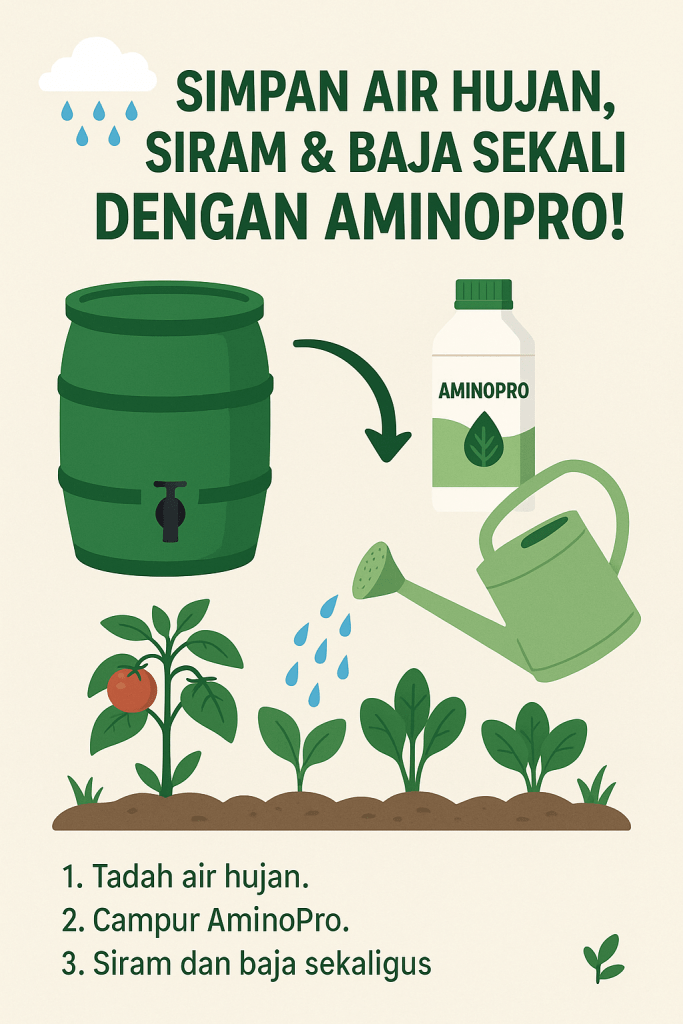 Lebih menarik, air hujan yang ditadah ini boleh terus digunakan untuk menyiram sambil membaja dengan AminoPro – baja cecair organik berasaskan asid amino yang direka khas untuk mempercepatkan pertumbuhan daun, menguatkan akar, dan membantu tumbesaran tanaman dalam cuaca yang tidak menentu.