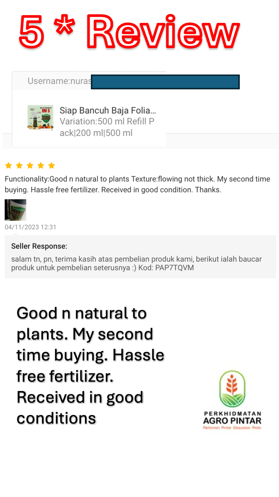 “Good and natural to plants. My second time buying. Hassle free fertilizer. Received in good conditions.”
