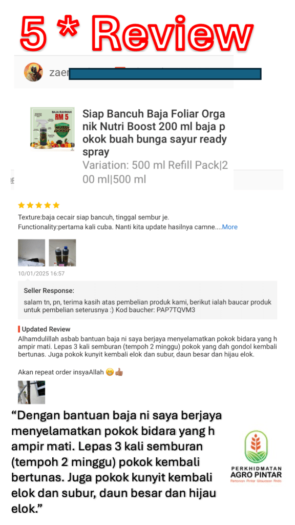 Bertunas semula bukan sekadar daun baru — ia tanda pokok kembali hidup dan stabil. Testimoni ini membuktikan bahawa Nutriboost sesuai digunakan sebagai sokongan pemulihan, terutamanya bila pokok: