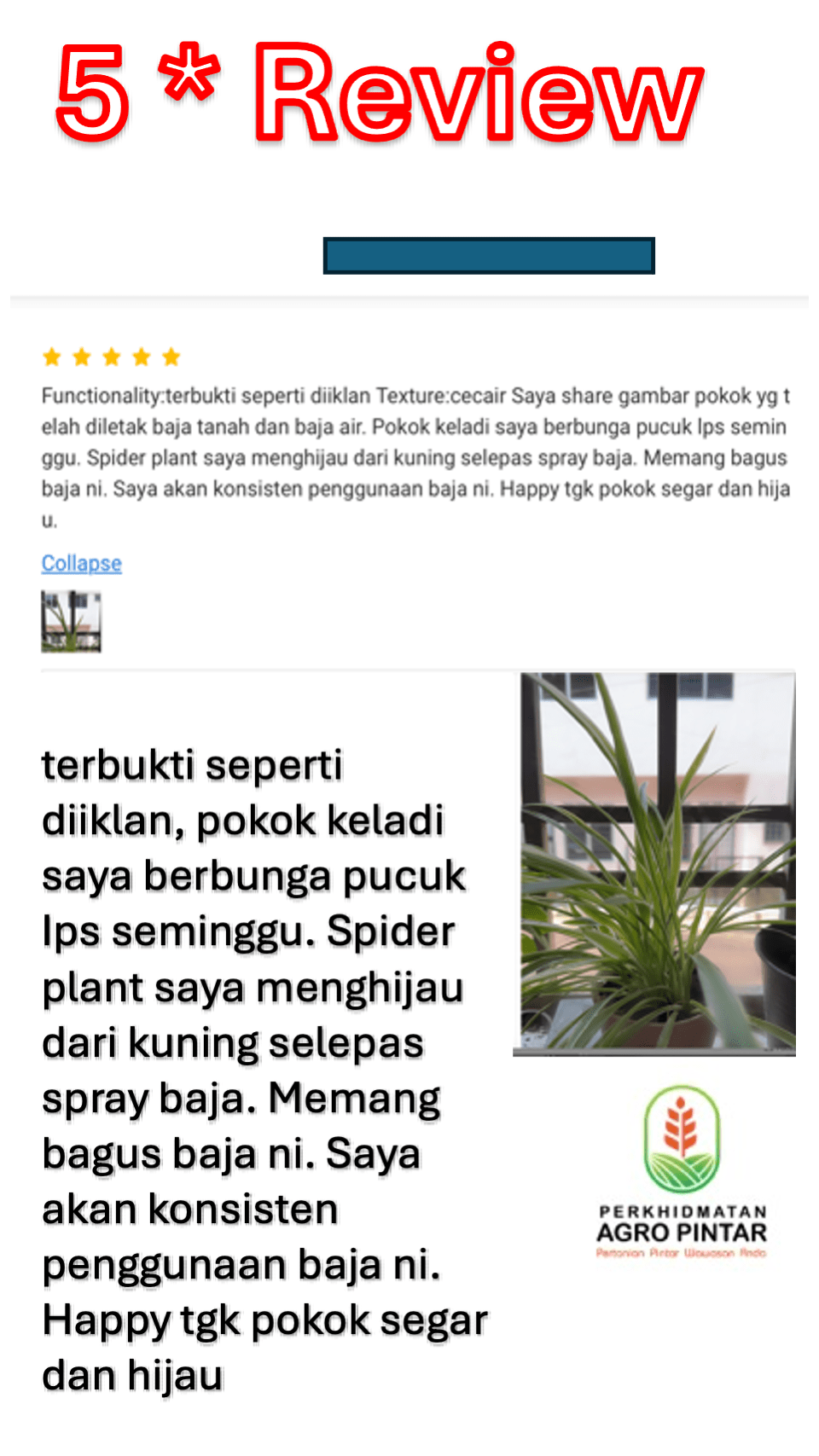 “Terbukti seperti diiklan, pokok keladi saya berbunga pucuk… seminggu. Spider plant saya menghijau dari kuning selepas spray baja. Memang bagus baja ni. Saya akan konsisten penggunaan baja ni. Happy tgk pokok segar dan hijau.”